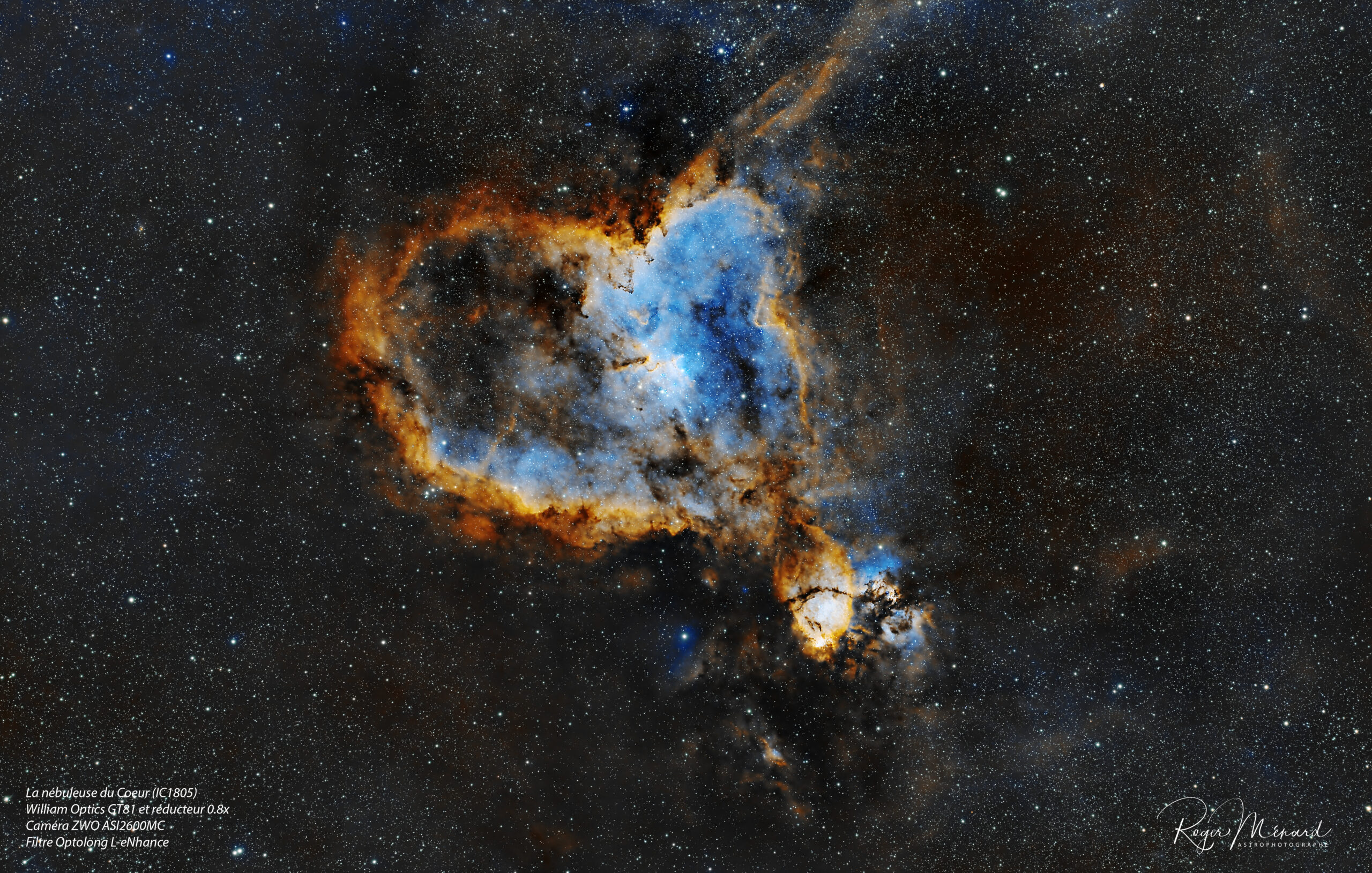 Cataloguée sous IC 1805, la nébuleuse du Coeur présesente un attrait indéniable à cause de sa forme. Elle est située à 6 500 années-lumière dans la constellation Cassiopée. Un amas ouvert d’étoiles massives (plus de 50x la masse du Soleil) se trouve en son centre et est catalogué Collinder 26 et Melotte 15. C’est ce groupe d’étoiles qui irradie la masse d’hydrogène ionisé et de poussière sombre.